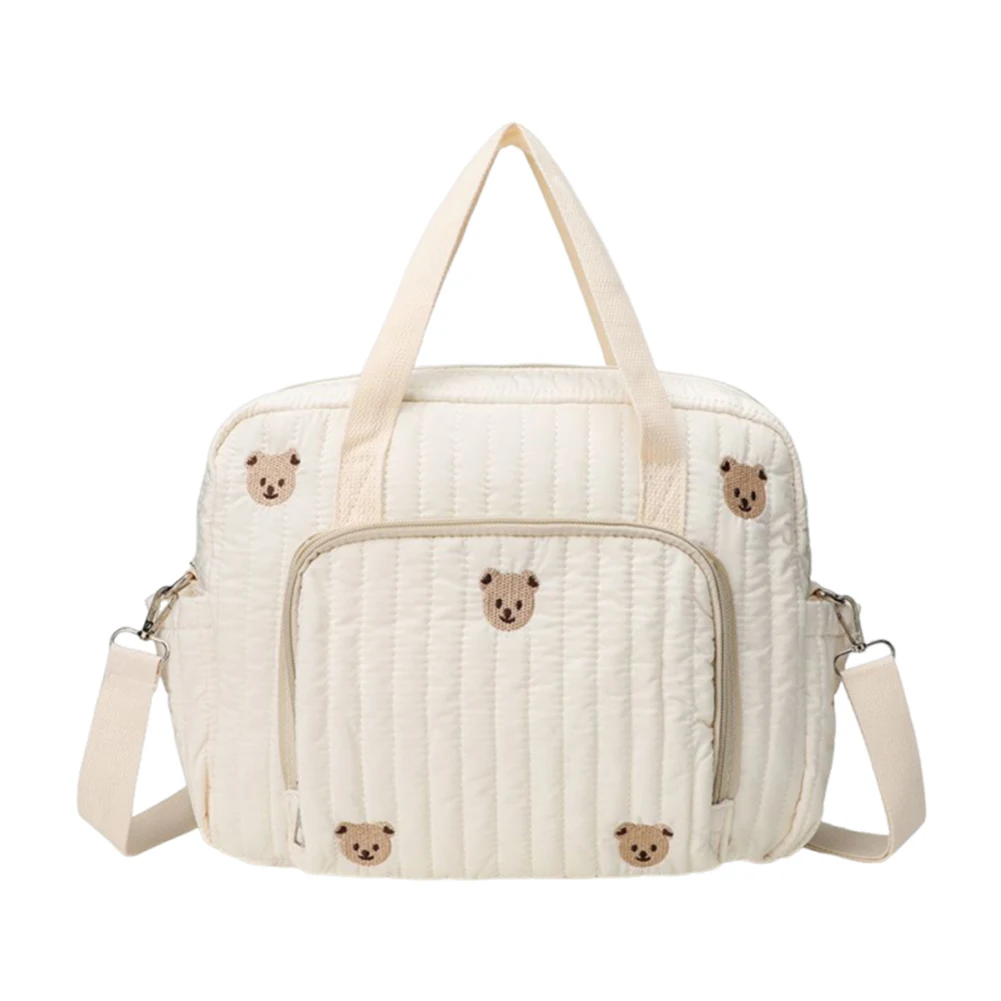 Meet your new favorite maternity companion: the Quilted Bear Flower Mommy Diaper Bag. This versatile tote can be worn as a crossbody or carried as a handbag, and it’s spacious enough for all baby essentials : diapers, bottles, wipes and more. Made of durable cotton with quilted detailing and an adorable bear-flower design, it also features multiple interior and exterior pockets for organization. The adjustable strap ensures comfortable carrying whether you’re out for errands or attending appointments. Stylish, functional, and built for moms on the move.